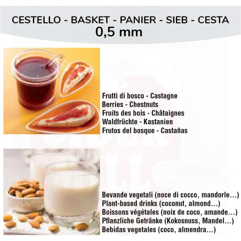 To be used in addition to the 1mm basket, it is designed to filter the finest fibres and impurities. Particularly suitable for berries, chestnuts and vegetable drinks based on coconut, almonds, etc.