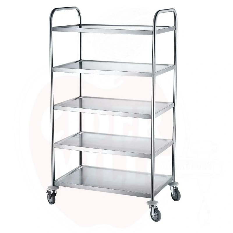 Practical mobile shelving system made of stainless steel is ideal for food industry, manufacturing and warehouses. The five-level shelf is equipped with four quality wheels, two of which are fitted with safety brakes.