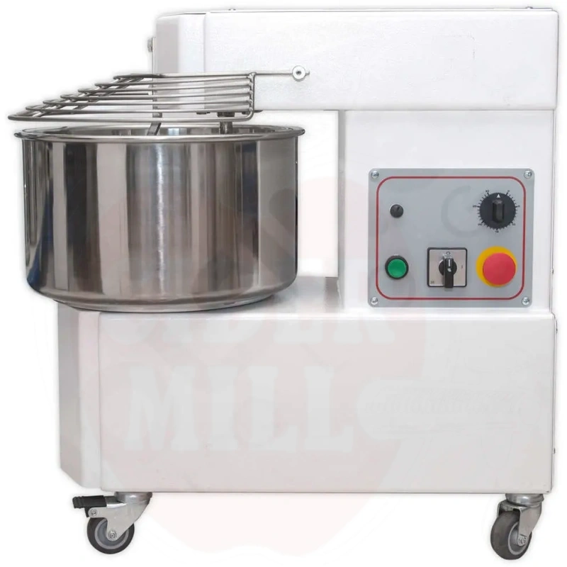 Properties: Spiral-shaped kneading allows minimum processing time without overheating the dough. The frame is robust steel, eliminating vibration. All components in contact with dough—the bowl, spiral, central shaft, and protection cover—are stainless steel. Features include chain drive with oil bath lubrication, four wheels (two with brakes), and control panel with on/off, start, emergency stop, timer, and fuse.