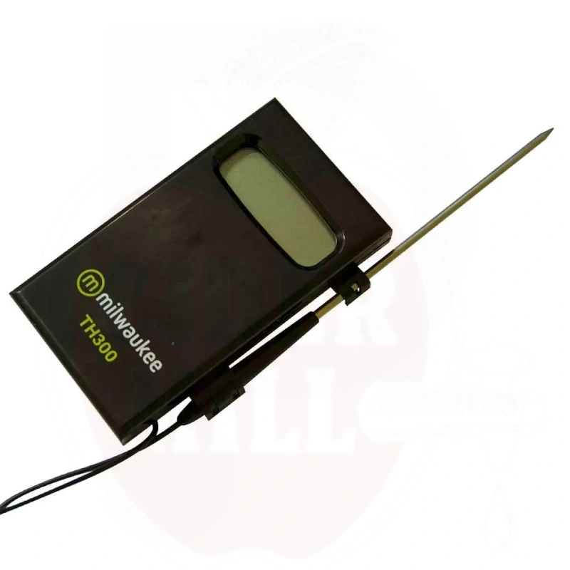 Usage: Electronic thermometer TH300 with probe for precise temperature measurements in brewing, winemaking, and food production. Built-in digital display with table stand and pocket clip. Probe cable length 1m. Measuring range -50°C to +150°C.