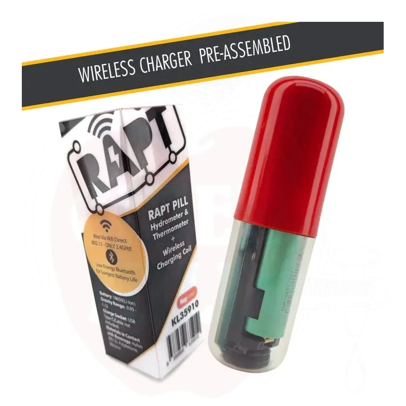 RAPT Pill is a precise and reliable wireless hydrometer and thermometer that allows real-time monitoring of beer fermentation gravity and temperature. The device comes pre-assembled with an integrated wireless charging coil and works with any QI-certified charger.