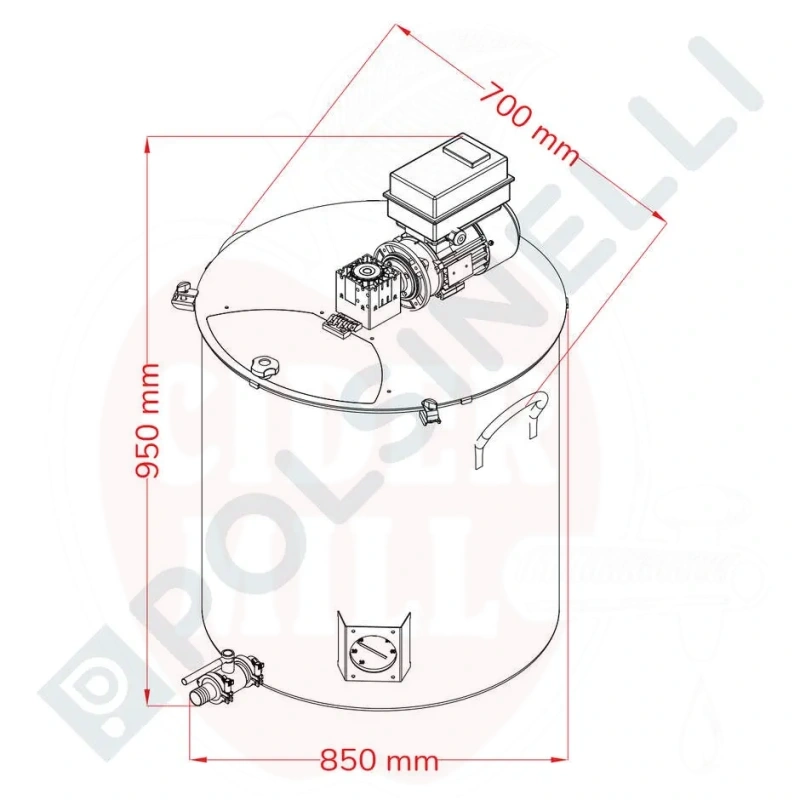 Tehnilised andmed: Maht: 200L. Materjal: AISI 304 roostevaba teras. Võimsus: 0,18kW. Siseläbimõõt: 630mm. Kõrgus: 680mm. Üldmõõtmed koos mootoriga: 700 x 905mm (k). Seina paksus: 1mm. Põhja paksus: 1,5mm.