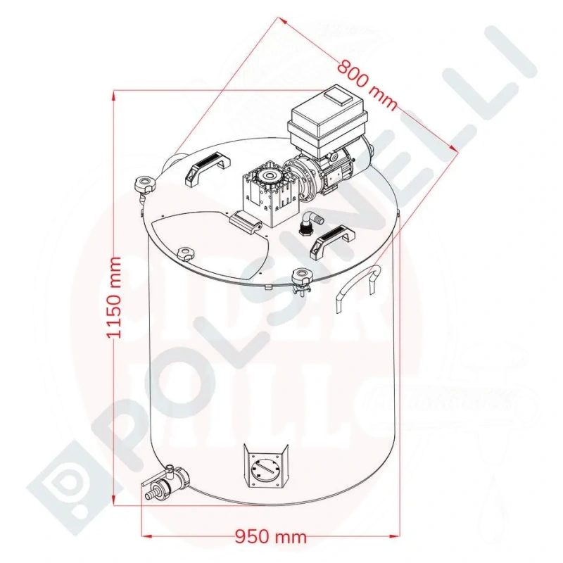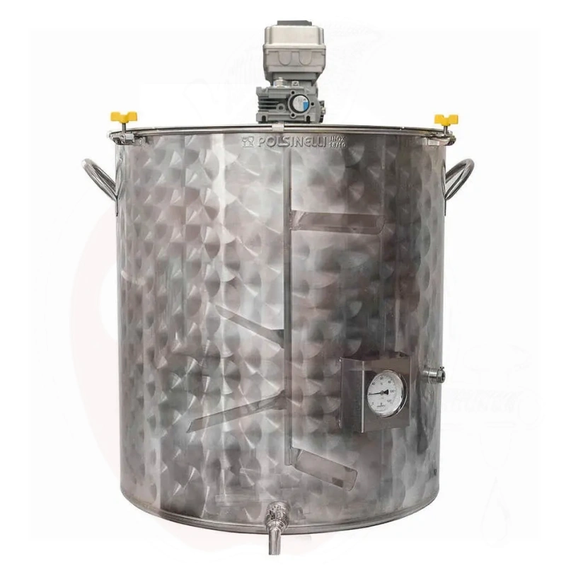 Omadused: 18/10 roostevaba teras (AISI 304), paks põhi temperatuuri stabiilsuse tagamiseks, reduktoriga mootor inverteriga (6-42 rpm muudetav kiirus), pööratav pöörlemine, digitaalne juhtpaneel, professionaalne analoogtermomoeter roostevaba terase kaitsega, DIN25 kuulkraan voolikuotsikuga Ø 20mm, pesupea PG20 voolikuotsikuga, paks kaas roostevaba terase konksudega, roostevaba terase sangad.