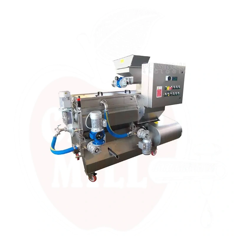 Omadused: Kõik oliividega kokkupuutuvad osad on valmistatud roostevabast terasest. Varustatud reguleeritava kiirusega sööturiga, kõrge efektiivsusega purustajaga koos võrguräbustiga (spiraalkujulised terad), temperatuurikontrolliga pastakambriga (18°C kuni 25°C), kahekordse sõtkumiskausiga (2 × 100kg) ja PSS1 pumbaga õli eraldamiseks. Õli ja jäägid eraldatakse eraldi reguleeritavate düüside ja pumpade kaudu.