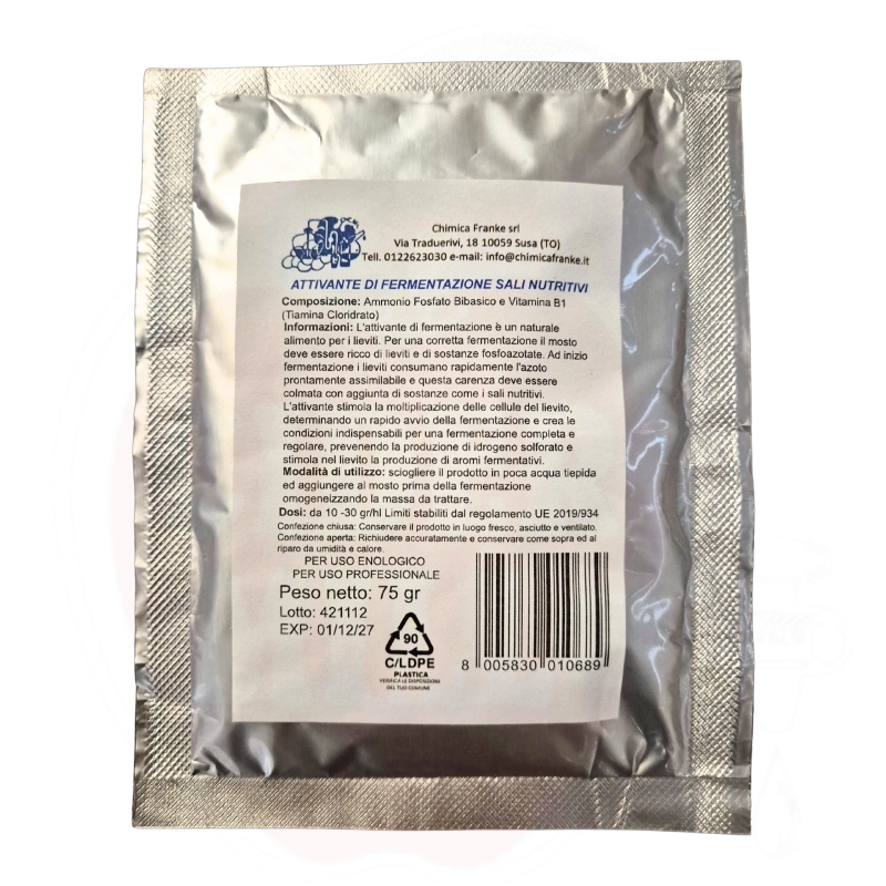 Aktivaator sisaldab kahealuselist ammooniumfosfaati ja vitamiin B1 (tiamiinvesinikkloriid), mis on olulised komponendid eduka veinivalmistamise protsessis.