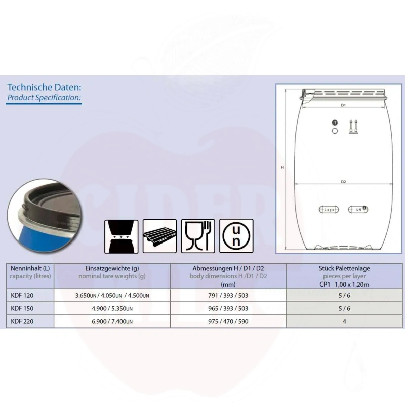 Vaat on valmistatud toiduohutuse nõuetele vastavast HDPE (kõrgtihe polüetüleen) materjalist. See tagab mahlade, veinide ja muude toiduainete kvaliteedi ning maitse säilimise. Konstruktsioon mõõtudega 965 mm kõrgus ja 503 mm diameeter mahutab 150 liitrit, kaela laius 393 mm võimaldab lihtsa ligipääsu.
