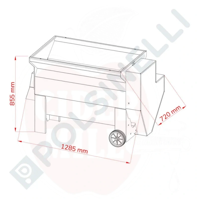 Omadused: Tugev metallist raam, eemaldatav roostevaba terasest võre, suur 640 x 1000mm mahuti kruvitranspordiga, lihtne puhastussüsteem, rattad lihtsamaks liigutamiseks, ühilduv 60mm läbimõõduga torudega.