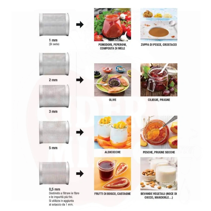 Omadused: Valmistatud täielikult roostevabast terasest. Asünkroonne mootor, 650W võimsus, 230V ühefaasiline. Pidev toote sisestamine ja jääkide väljalükkamine. Kiirus: 1500 p/min. Läbilaskevõime: 60 kg/tunnis. Kaasas 1mm aukudega sõel.