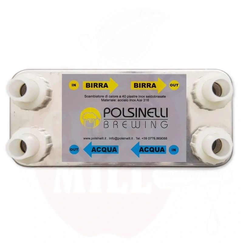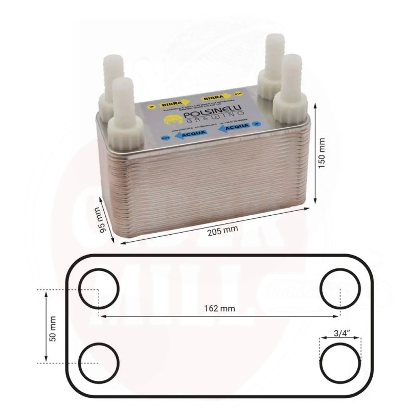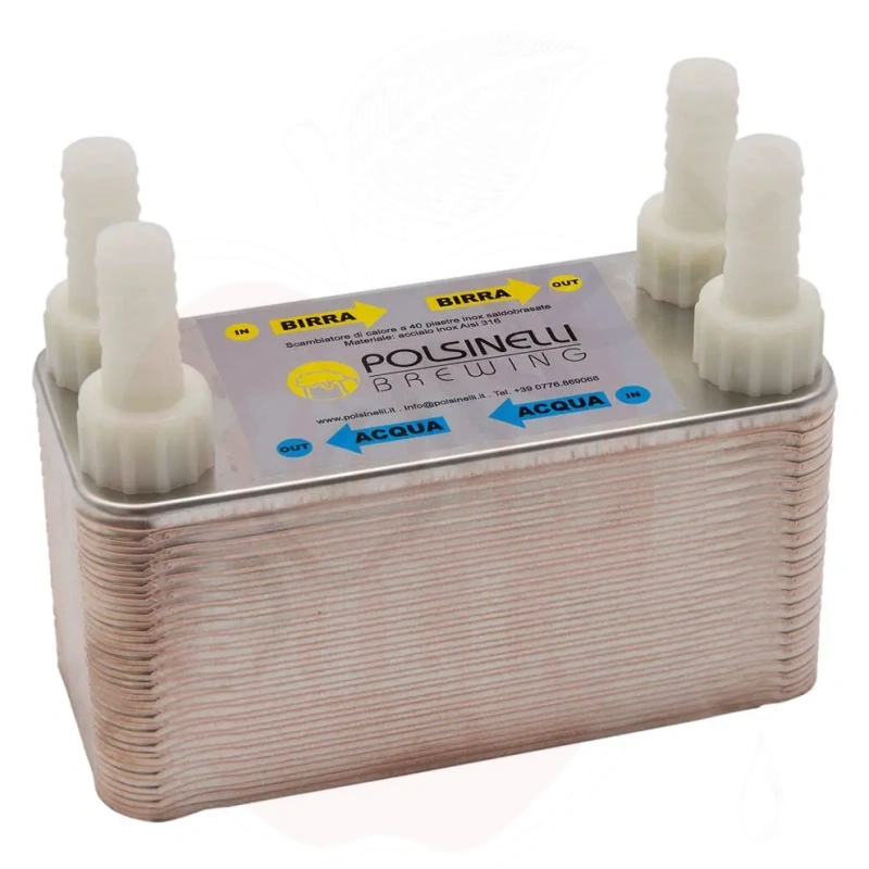 Kavandatud kasutus: Sobib sooja tarbevee tootmiseks, tööstuslikuks jahutamiseks ja külmutamiseks (aurusti/kondensaator). Võimaldab vastuvoolu ja paralleelset voogu paindliku sisselaske/väljalaske konfiguratsiooniga. Ei sobi hapetele, ammoniaagile ega mereveele. Põhiomadused: 40 joodetud plaati (AISI 316L/304, vask 99,9%), tihenditeta. Voolikupesa Ø20 mm. Kompaktne, talub suurt rõhku ja temperatuuri. Vahetuspindala: 0,57 m². Kanalite maht: 0,78 L. Maksimaalne vool: 6 m³/h. Kõrgus: 150 mm; laius: 95 mm; pikkus: 205 mm; kaal: 2,8 kg. Keermestatud gaasiliitmikud: 3/4". Töörõhk: kuni 10 bar. Temperatuur: -10°C kuni +90°C. Tehnilised andmed: Roostevaba teras AISI 316L (plaadid), AISI 304 (ühendused), vaskjoodi. Maksimaalne töörõhk: 10 bar. Temperatuurivahemik: -10...+90°C. Hoiatused: Kasutada ainult mitteagressiivsete vedelikega. Pärast kasutamist pesta kohe, loputades ja kasutades leeliselist lahust. Desinfitseerimiseks lasta läbi peräädikhappe lahus. Kemikaalide käsitsemisel kanda asjakohast isikukaitsevarustust. Hoida puhtana ja kuivana. Hapete, ammoniaagi või mereveega mitte kasutada vase korrosiooniohu tõttu.