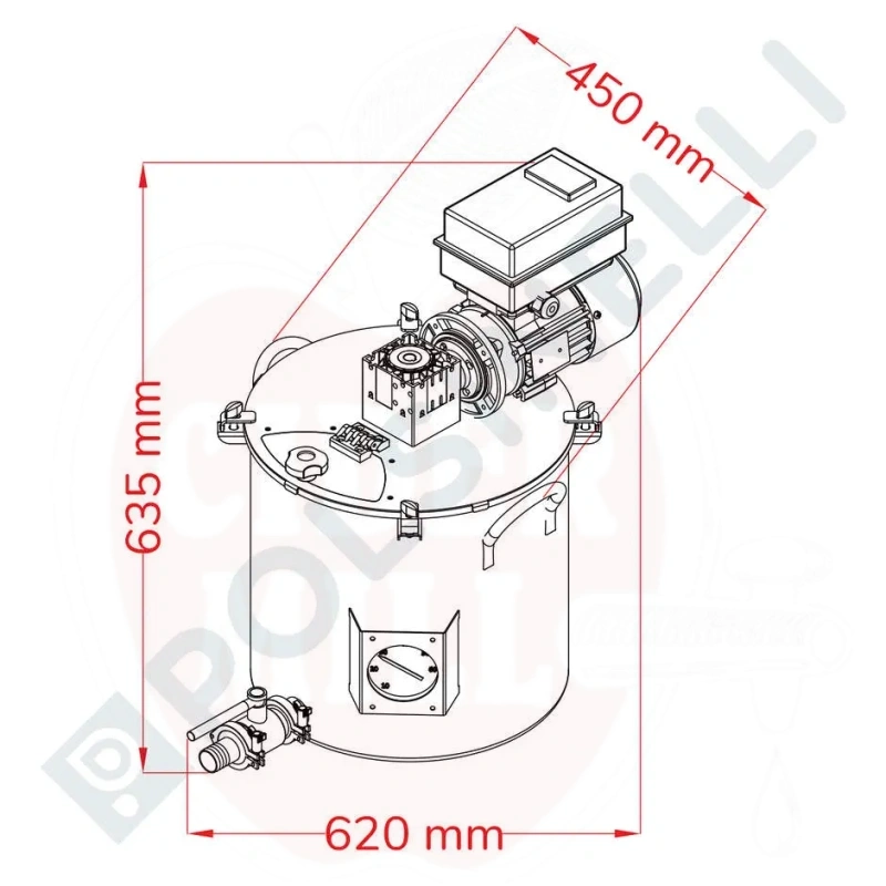 Tekniset tiedot: Materiaali: AISI 304 ruostumaton teräs (18/10). Tilavuus: 35L. Yksivaiheinen 220V moottori näytöllä. Tehonkulutus: 0,18kW. Vaihteisto 1:50 taajuusmuuttajalla: säädettävä nopeus 6-42 rpm. Sisähalkaisija: 370mm. Korkeus: 370mm. Kokonaismitat moottorin kanssa: 450 x 605mm (k). Seinämän paksuus: 1mm. Pohjan paksuus: 1,5mm.
