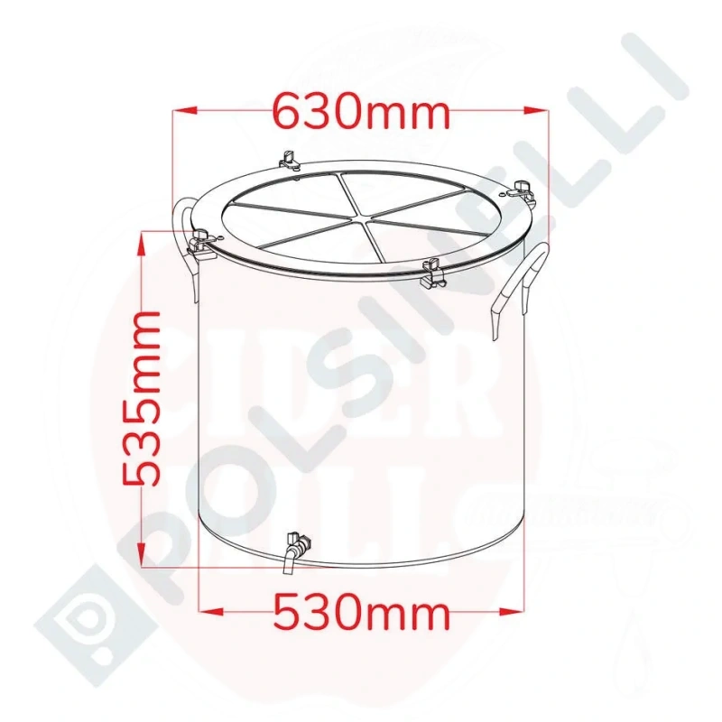 Tekniset tiedot: Tilavuus: 100L. Materiaali: AISI 304 ruostumaton teräs. Halkaisija: 530mm. Korkeus: 510mm. Seinämän paksuus: 0,6mm. Pohjan paksuus: 0,6mm.