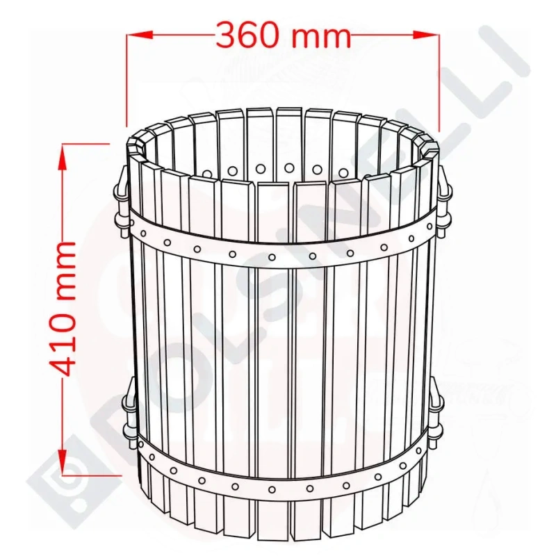 Tekniset tiedot: Sisähalkaisija: 30cm. Ulkohalkaisija: 36cm. Korkeus: 41cm. Rypäleiden kapasiteetti: 50kg.