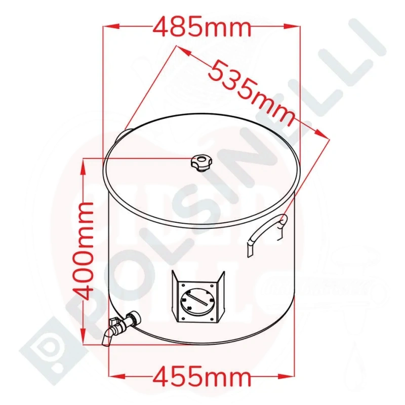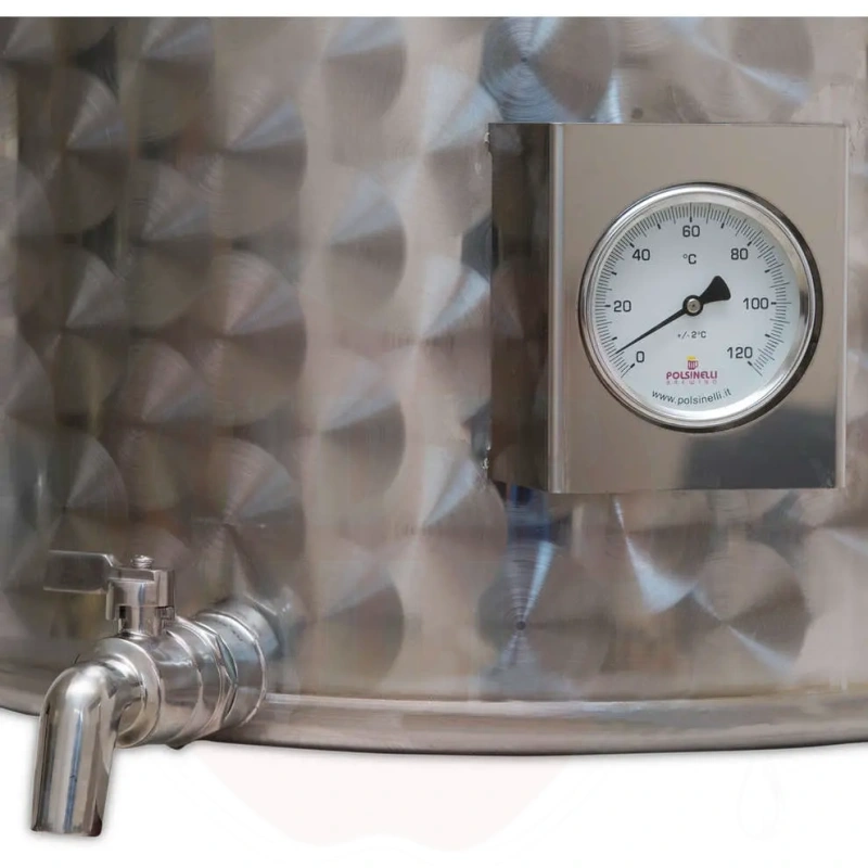Savybės: Pagamintas iš AISI 304 nerūdijančio plieno (18/10). Komplekte nerūdijančio plieno 3/4" čiaupas, profesionalus analoginis termometras, dangtis su rankena ir rankenos. Termometro zondo įėjimas tiksliam temperatūros stebėjimui.