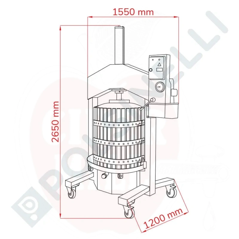 Naudojimas: Profesionali vertikali hidraulinė spaudyklė vaisių perdirbimui (vynuogės, vyšnios, slyvos, obuoliai). Puikiai tinka vyno gamybai ir vaisių aliejaus gamybai.