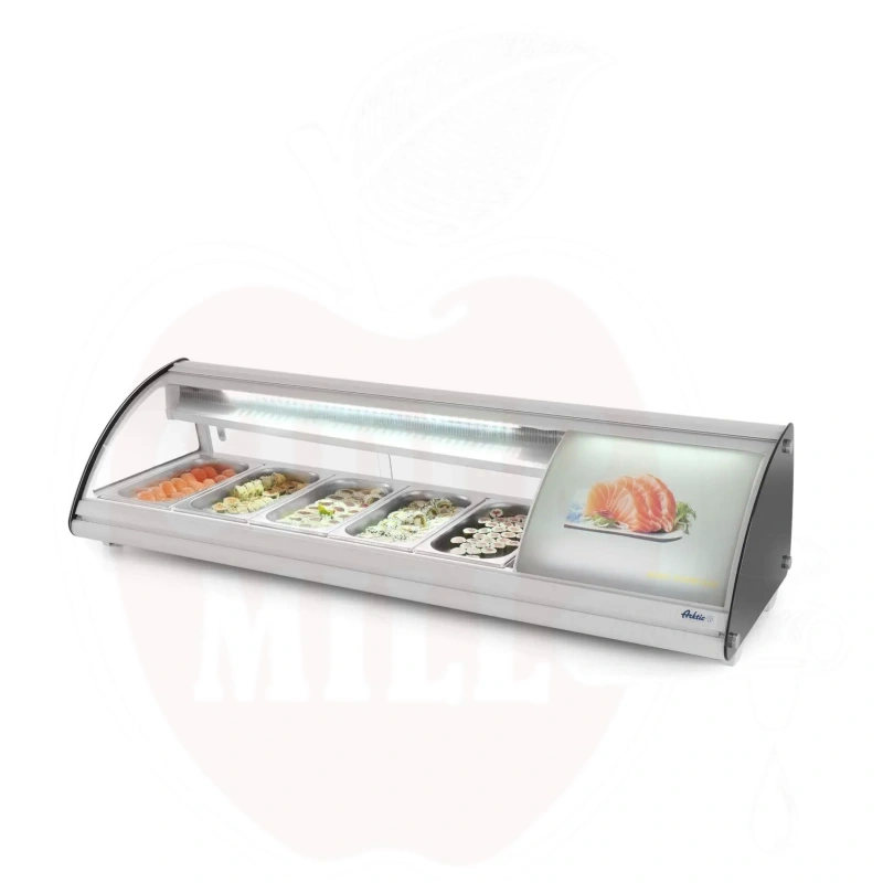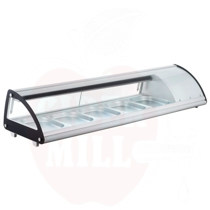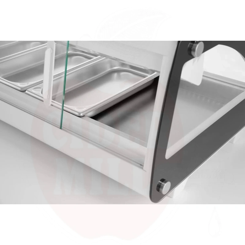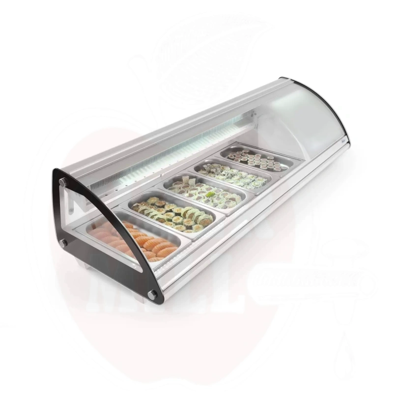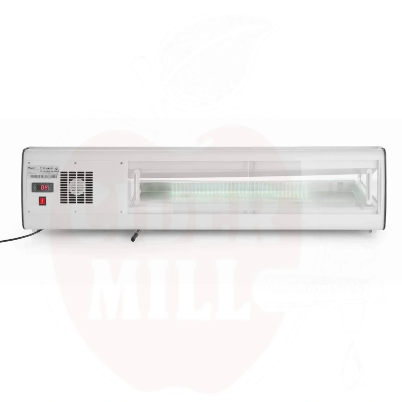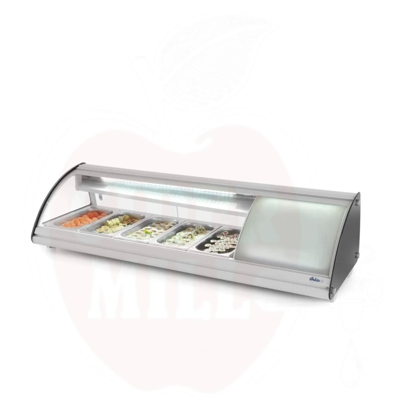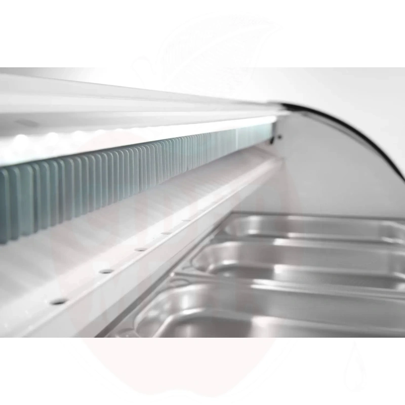 Šis modernus nerūdijančio plieno vitrininis šaldytuvas su baltu korpusu skirtas profesionaliam maisto laikymui ir eksponavimui. Dvigubas išgaubtas stiklinis dangtis apsaugai ir matomumui. Patogus priėjimas per dvejas galines slankiojančias dureles arba pakeliamą stiklinį dangtį. Talpa 5x GN 1/3 indai (aukštis iki 40 mm). Energiją taupantis LED apšvietimas. Viršuje montuojamas garintuvas. Aprūpinta statine šaldymo sistema su automatinio atitirpinimo funkcija. Skaitmeninis temperatūros valdiklis ir ekranas užtikrina tikslų temperatūros stebėjimą.