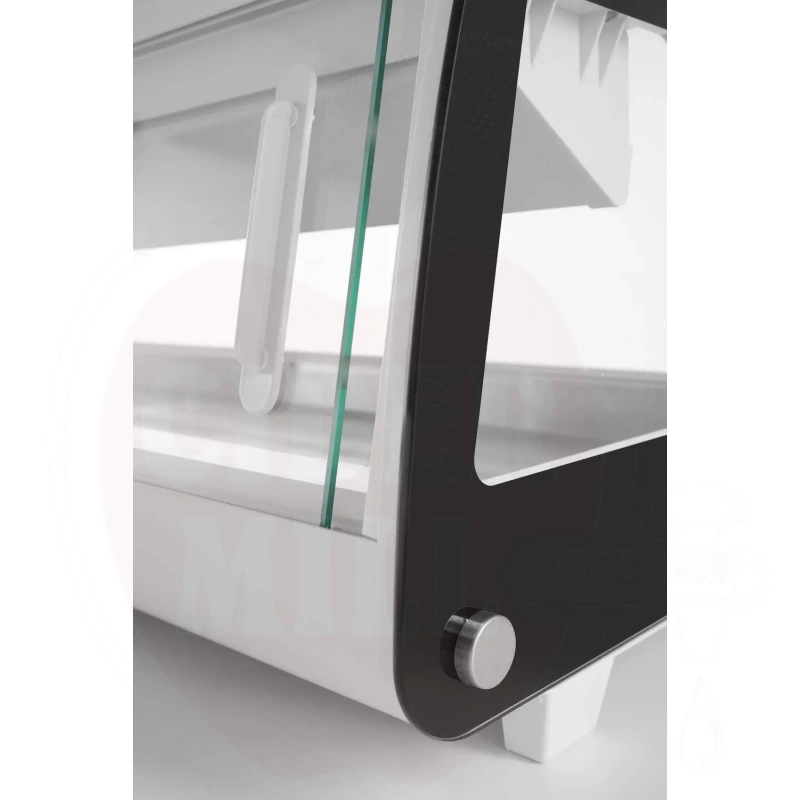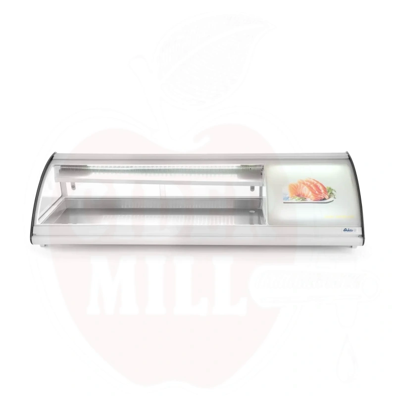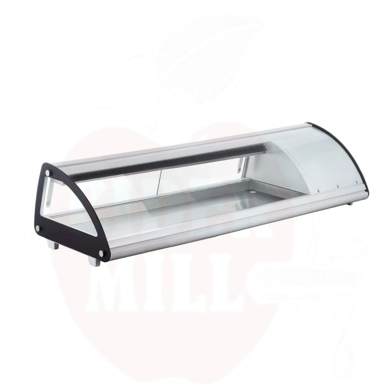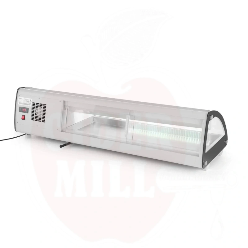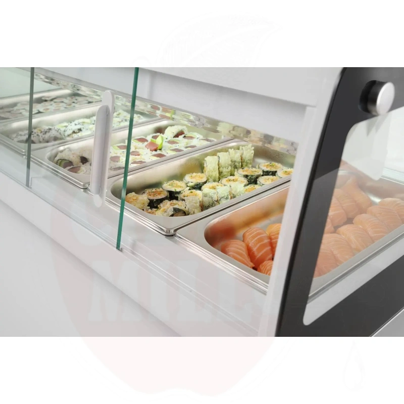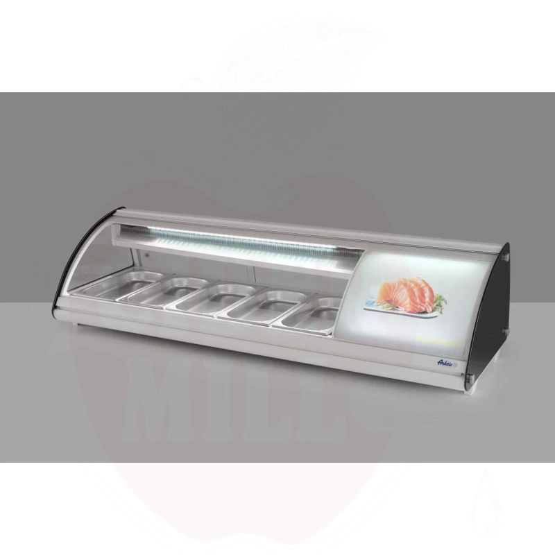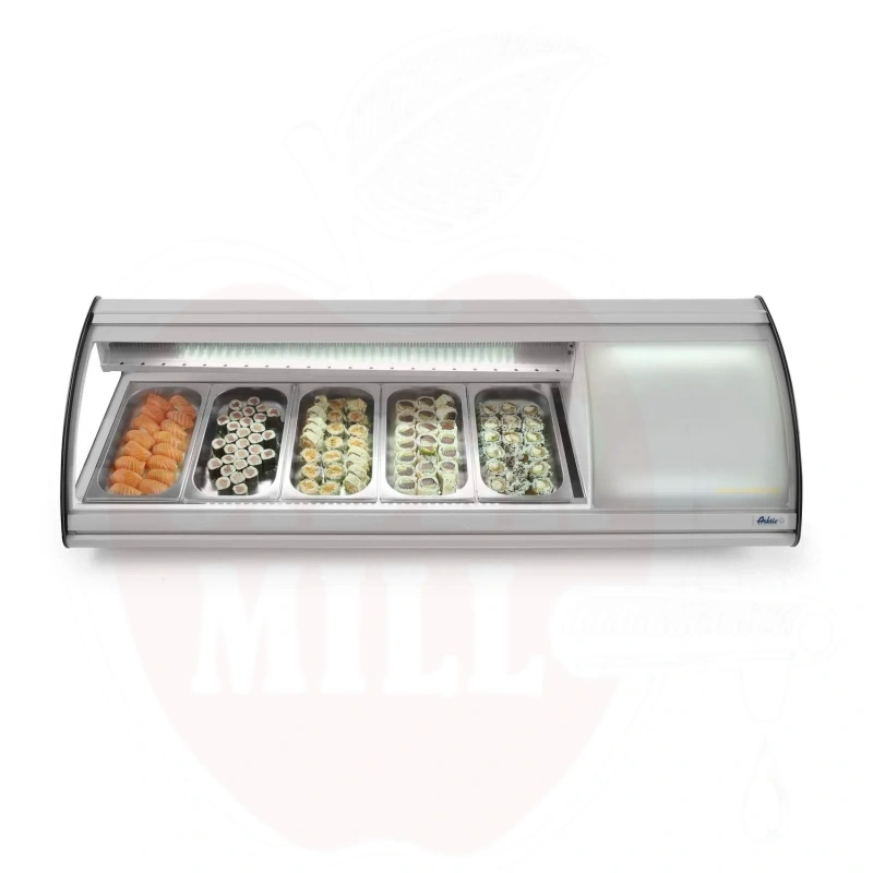 Šis modernus nerūdijančio plieno vitrininis šaldytuvas su baltu korpusu skirtas profesionaliam maisto laikymui ir eksponavimui. Dvigubas išgaubtas stiklinis dangtis apsaugai ir matomumui. Patogus priėjimas per dvejas galines slankiojančias dureles arba pakeliamą stiklinį dangtį. Talpa 5x GN 1/3 indai (aukštis iki 40 mm). Energiją taupantis LED apšvietimas. Viršuje montuojamas garintuvas. Aprūpinta statine šaldymo sistema su automatinio atitirpinimo funkcija. Skaitmeninis temperatūros valdiklis ir ekranas užtikrina tikslų temperatūros stebėjimą.