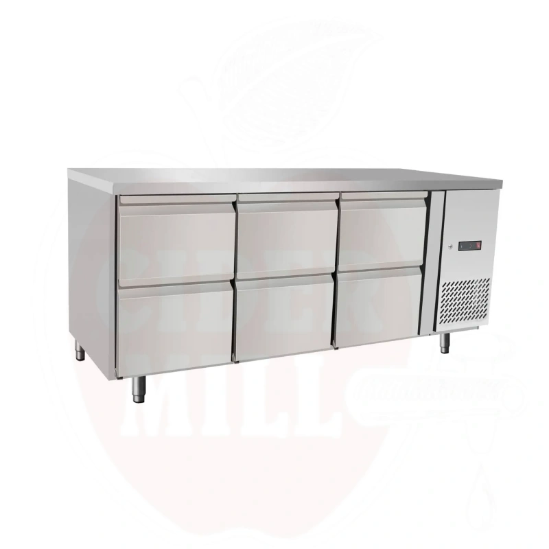 Iekšējais un ārējais korpuss izgatavots no augstas kvalitātes nerūsējošā tērauda. Ārējais aizmugures pārsegs no cinkota tērauda. Ietver 6 atvilktnes. Piespiedu gaisa dzesēšana ar automātisko atkausēšanu, kompresors novietots blakus kamerai. 50 mm bieza poliuretāna putas izolācija. Digitālais displejs un elektroniskais termostats. Ar 4 kājām.