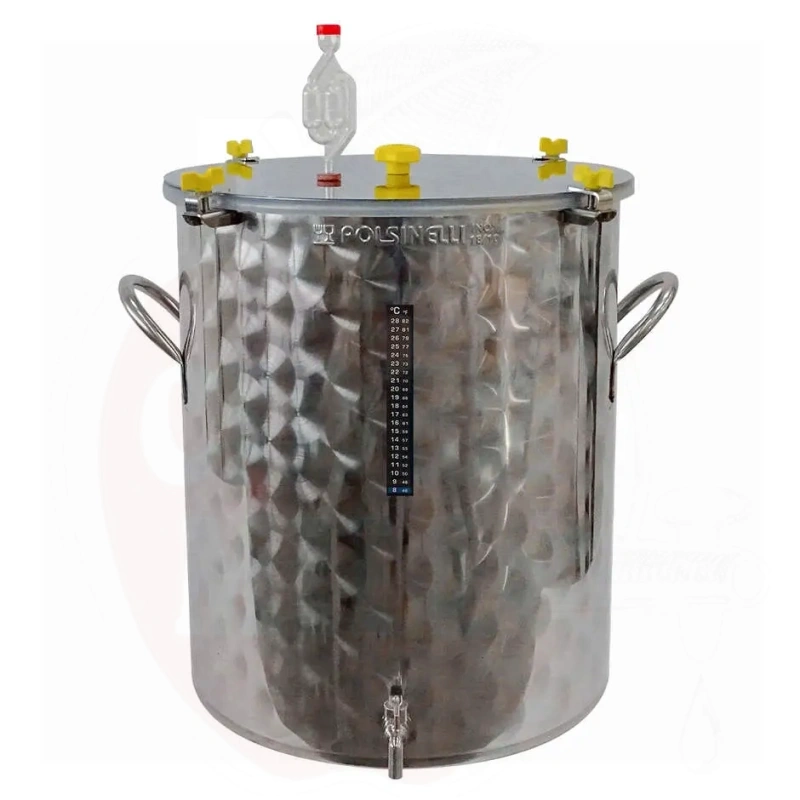 Īpašības: AISI 304 nerūsējošā tērauda konstrukcija ar ziedu izspiestā ārējo virsmu, noapaļotu metināto dibenu vieglai tīrīšanai, ērtas rokturu pārvietošanai, raudzēšanas korķi, bieza vāka ar 4 hermētiskās aizvēršanas āķiem, metinātu uzgriezni, ½" krānu un LCD digitālo termometru.