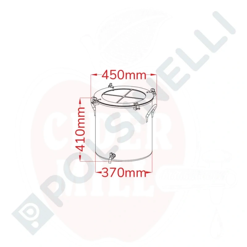Īpašības: Noapaļots metināts dibens vieglai tīrīšanai, nerūsējošā tērauda ar vītni aprīkots uzgalis krāna pievienošanai, ērtas rokturi pārvietošanai. Komplektā ietilpst biezs nerūsējošā tērauda vāks ar kokvilnas blīvējumu, 4 nerūsējošā tērauda āķi vāka blīvēšanai, ½" nerūsējošā tērauda krāns un puķu reljefu ārpusē.